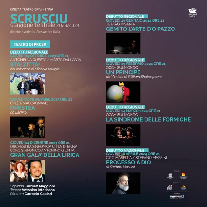 Da quello passato, con L’Orestea da Eschilo di Cinzia Maccagnano, da quello presente con La Sindrome delle Formiche di Daniele Aureli la stagione si presenta al pubblico con 4 debutti regionali, 1 debutto nazionale ed un Gran Galà della lirica diretto da Carmelo Capizzi come scommessa, a partire da questa seconda stagione, di aprire il teatro a tutti i generi coinvolgendo il pubblico più svariato.